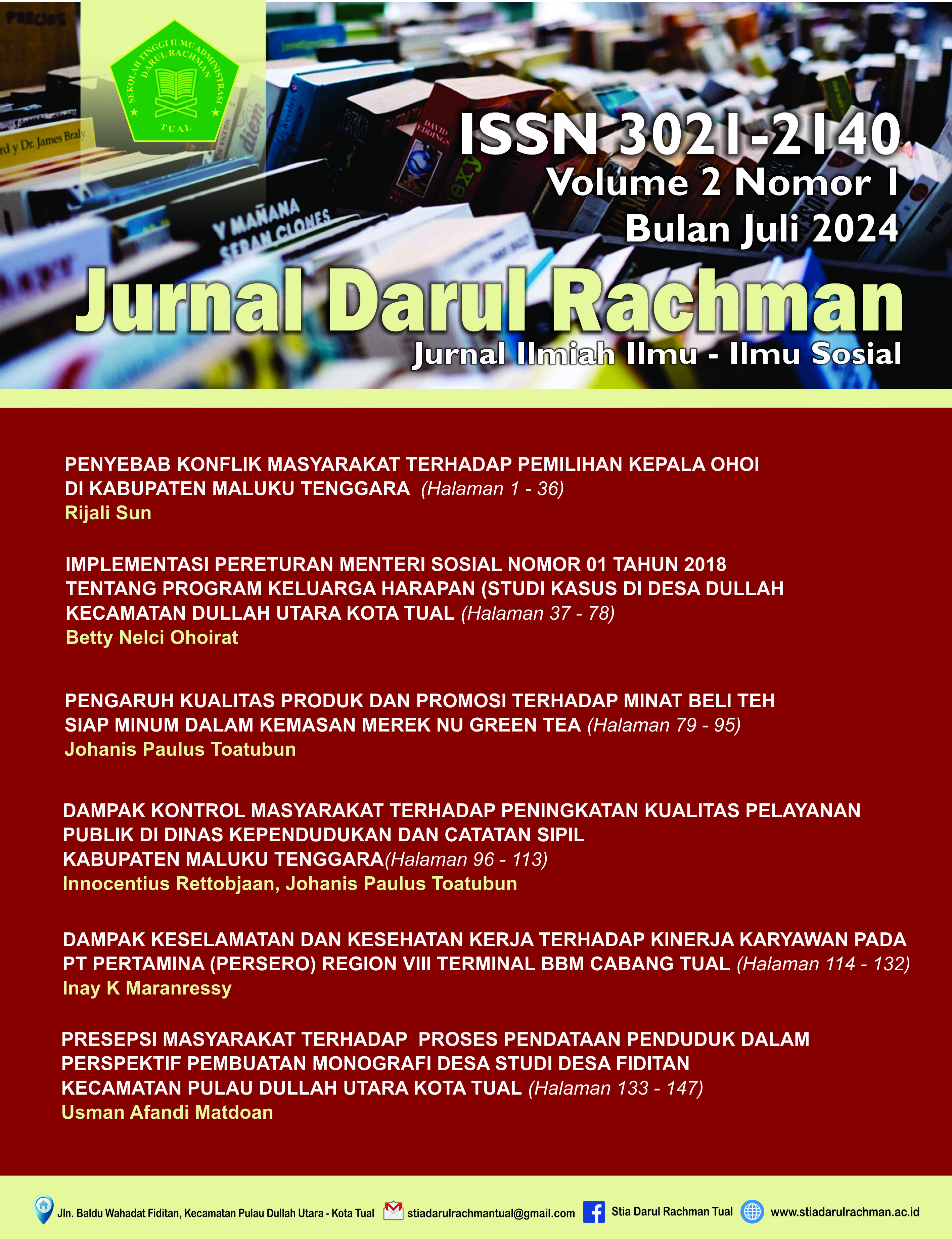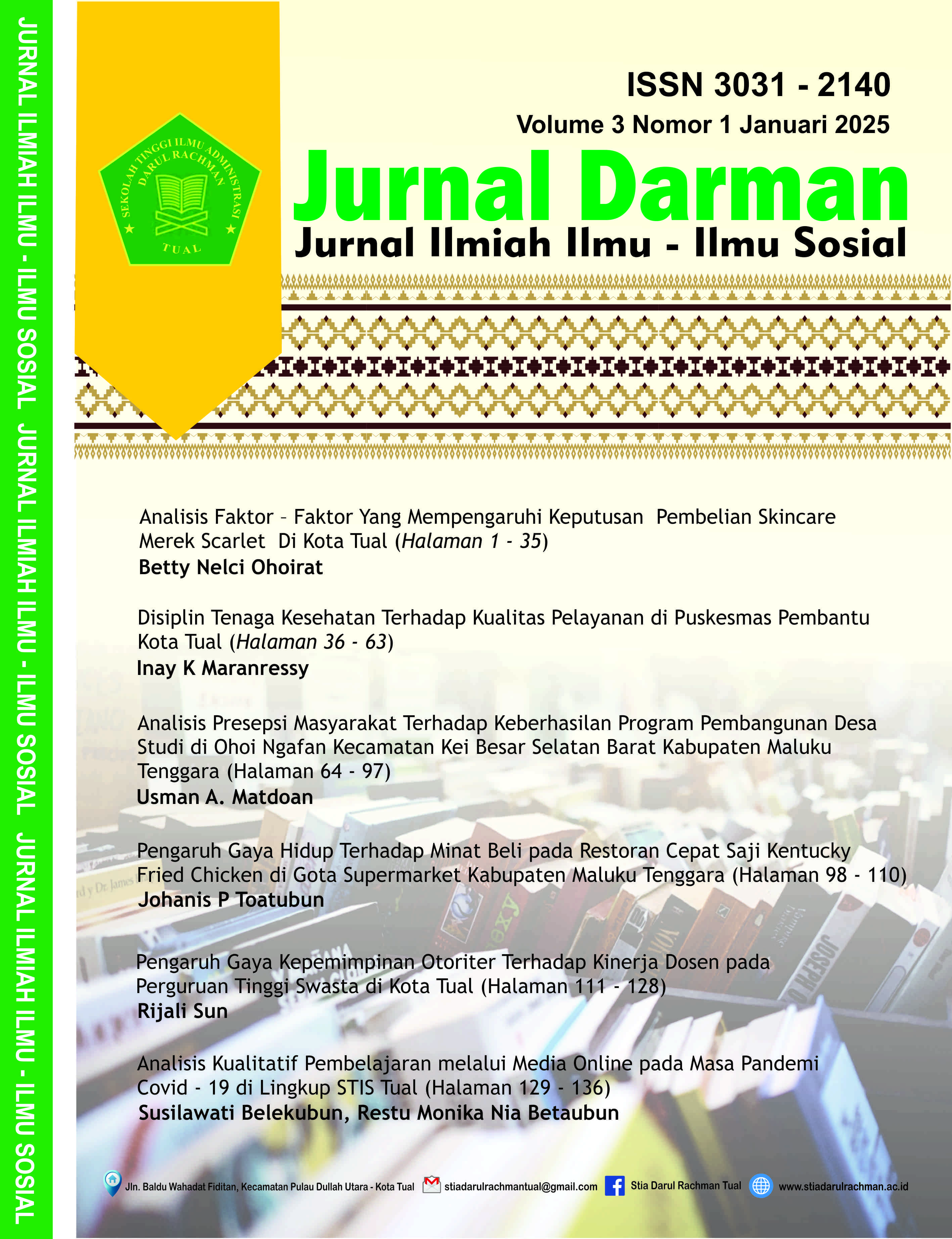 Darman Journal, Darul Rachman Tual College of Administrative Sciences. contains various research information from lecturers and students with contemporary concepts. The Darman Journal is a means of accommodating scientific works in the form of theoretical and practical studies for experts, experts and academics in the field of Social Sciences. This scientific journal is published by the Institute for Research and Community Service, Darul Rachman Tual College of Administrative Sciences. Starting to be published with a frequency of publication 3 times a year, namely in February, June and November. The Darman Journal of the Darul Rachman Tual College of Administrative Sciences aims to become a leading scientific journal and is recognized for disseminating the results of ideas in the social field. Darman Journal accepts research papers, review articles and book reviews, both in Indonesian and English. The scope of social science issues focuses on: (1) Administrative Sciences; (2) Political Science Cluster, and; (3) Social Sciences Cluster. Darman Journal supports any research results that meet the requirements for obtaining copyright according to applicable regulations. Every published research result has been edited without changing the original substance. The content of the article is the responsibility of the author and does not reflect the opinion of the publisher.